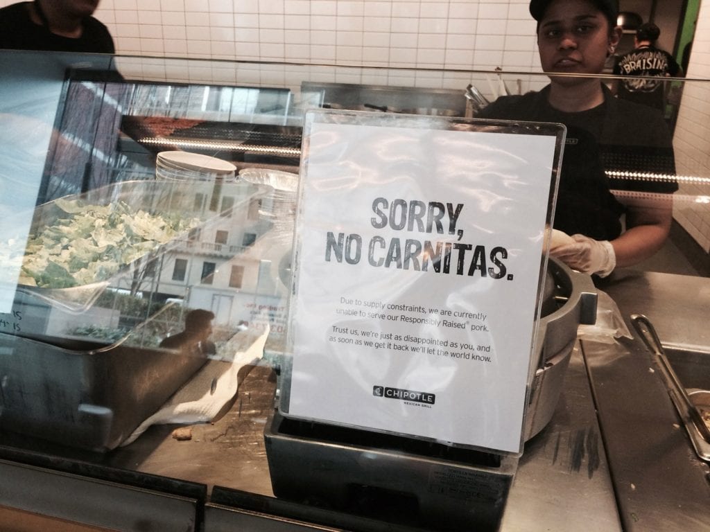 The New York Times reported on Jan. 15 that Chipotle is taking carnitas—which is made from braised or simmered pork shoulder—off its menu in 600 of its restaurants. Chipotle has posted signs at the restaurants that have pulled carnitas from the menu, saying, "Sorry, no carnitas. Due to supply constraints, we are currently unable to serve our Responsibly Raised pork. Trust us, we're just as disappointed as you, and as soon as we get it back we'll let the world know."