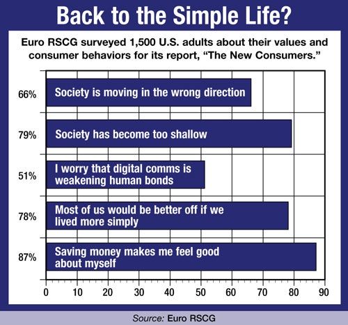 A new study of consumers by Euro RSCG shows a shift in consumer values and behaviors, as people begin to rethink what is important and how they want to live. Analyzing the findings of its “New Consumers” survey of 5,700 adults in seven markets (Brazil, China, France, Japan, Netherlands, United Kingdom and the United States), the study reveals how changes in consumer consciousness are driving people away from the hyper-consumerism of recent decades and toward a more mindful approach to living and consuming (see the key U.S. findings below).