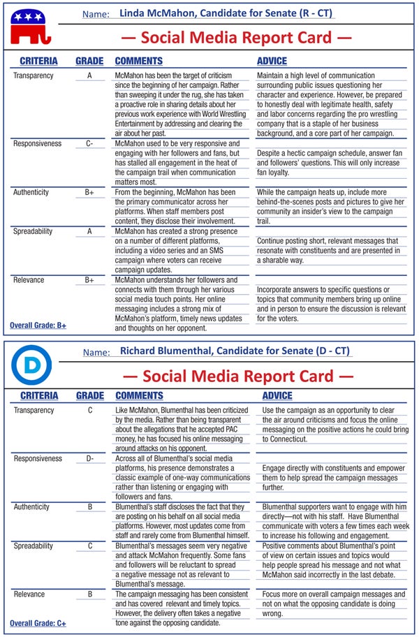 One race that has been particularly interesting to watch is between Senate candidates Linda McMahon and Richard Blumenthal in Connecticut. In our Social Media Report Card, we’ve taken a close look at their race to see who makes the grade. PRN