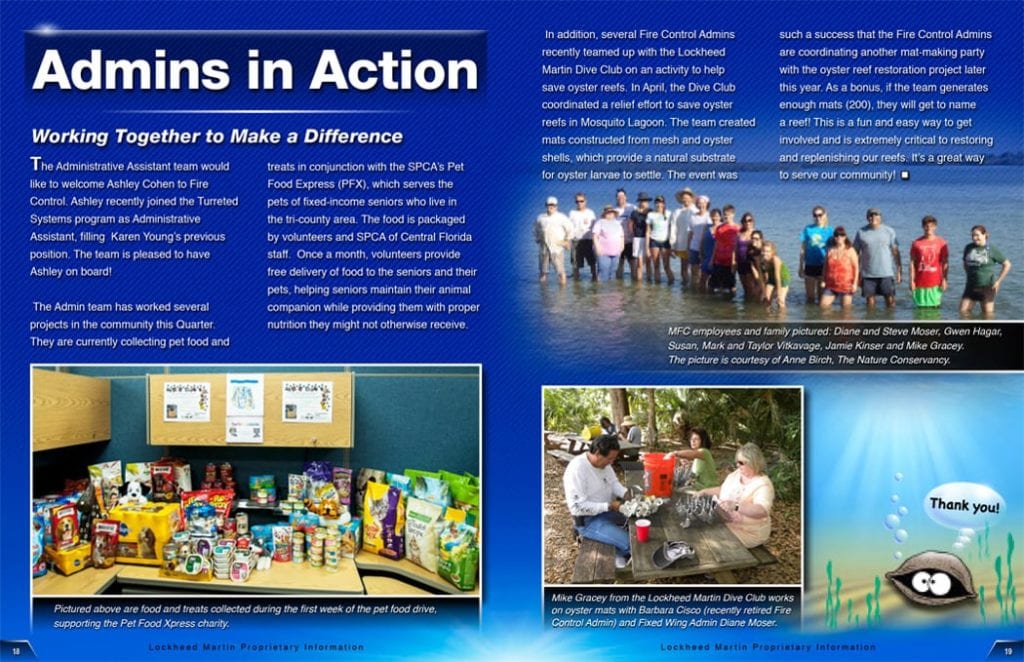 • In-depth, often technically focused feature articles, homing in one of Lockheed Martin’s programs. Feature articles range from stories covering systems upgrades, updates on new military contracts and major program milestones. The newsletter also runs “soft” features such as employee profiles, coverage of junior achievement and charitable efforts.