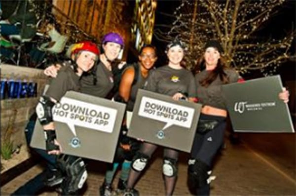 | Some of the Texas Rollergirls of the flat-track roller derby league in Austin rolled through SXSW Interactive spreading the word about the Hot Spots in Austin app. |
