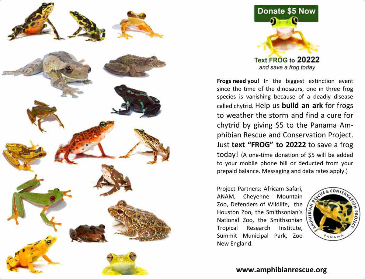 â–¶ Collateral materials were produced, including a tri-fold pamphlet that tells the story of the project and provides tips about how to get involved; a postcard showing a variety of Panamanian frogs that helps us tell the entire story of the decline (see image); and an annual project report was created with the goal of generating additional funding.
