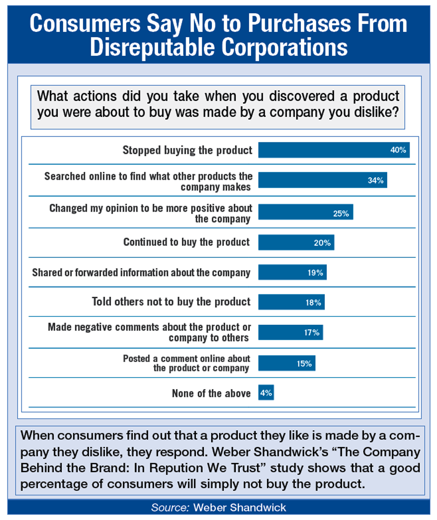 The survey of 1,375 consumers, and 474 senior executives in companies with revenue of $500 million or more finds that consumers are wary of buying products from disreputable corporate brands: 40% of consumers do not purchase the product when there is a disconnect between the product brand and the corporate brand (see details in the chart).