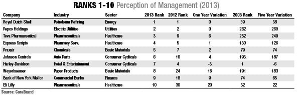 ▶ Telling a Positive Story (and Quickly): The rankings regarding positive perception of management include a pretty diverse group of companies, according to data tracked during a five-year period by brand consulting company CoreBrand. The data is drawn from CoreBrand’s proprietary Corporate Branding Index, an aggregate measure of the top 1000 companies representing both the size (familiarity) and quality (favorability) of a company’s brand. “With ‘perception of management,’ it’s really about the individual CEO being able to project a vision,” said Jim Gregory, CEO of CoreBrand. That speaks to the increasingly important role PR executives play in helping to articulate the message from the tippy top. “There needs to be clear communication from top management about the direction of the company,” Gregory said. PR execs are “the voice of management.”