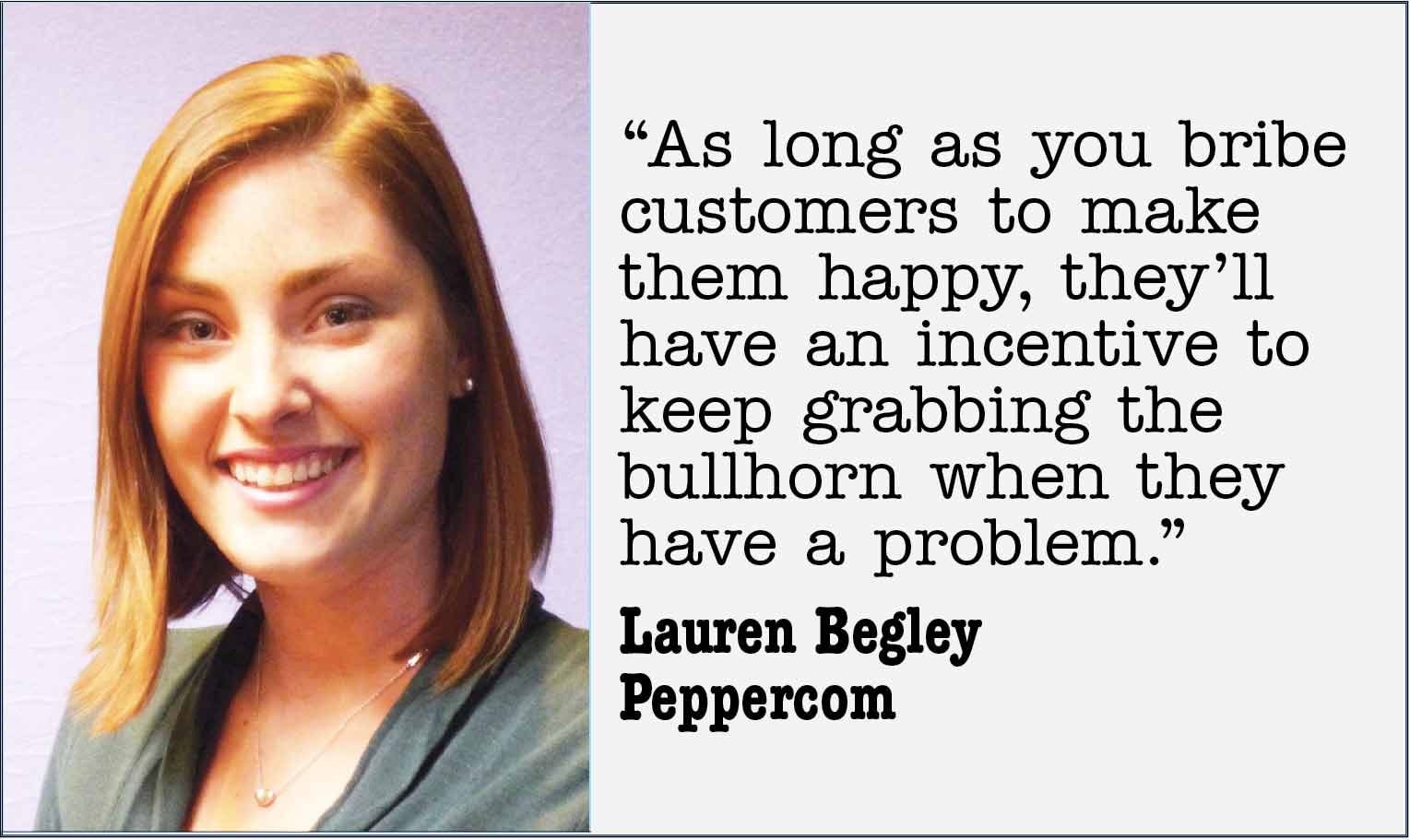 ”You can’t just give a coupon or other perks to customers to get them to stop complaining,” says Begley. “As long as you bribe customers to make them happy, they’ll have an incentive to keep grabbing the bullhorn when they have a problem.” And taking things “offline” to solve a problem won’t display the transparency and honesty needed to advance a brand’s reputation, she adds.