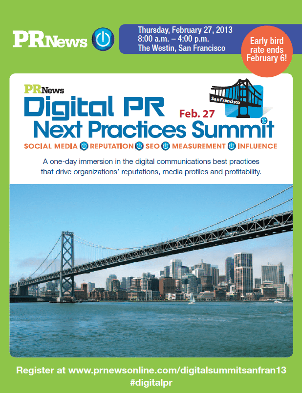 1Join us in San Francisco on Wednesday, Feb. 27, 2013, for the Digital PR Next Practices Summit, PR News' annual one-day immersion in the digital communications best practices that help drive organizations' reputations, media profiles and profitability. You'll get the how-to's, real-world examples and nut-and-bolts practical advice in using social channels to connect with journalists and win positive coverage, launch a content marketing strategy and gain visibility in search engines, apply visual storytelling practices to your communications efforts, make Twitter the center of your digital communications efforts, navigate the effects of Facebook's latest EdgeRank algorithm and much more. Be sure to also register for PR News' half-day SEO Workshop, which will take place the day before the Digital PR Summit on Feb. 26. A portion of the proceeds from PR News' Digital PR Next Practices Summit will be dedicated to One Laptop Per Child, a nonprofit organization that provides laptop computers to children in developing nations.