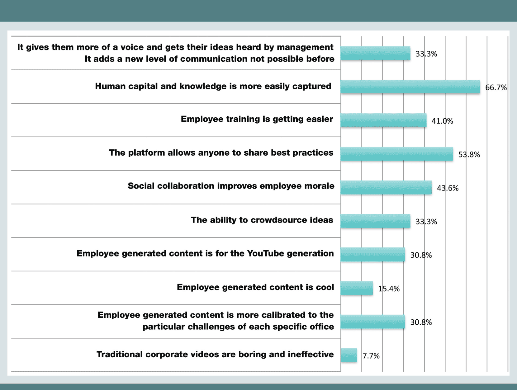 A study by Qumu of corporate executives and managers finds that employee-created videos have a positive effect on the organization. However, the study also found that the C-suite produces the most videos (51%) vs. the rank and file (14%).
