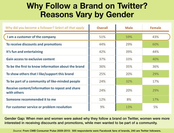 A new study on social media, “Why Social Media Matters to Your Business,” fielded by Chadwick Martin Bailey and Imoderate Technologies, highlights, among other findings, the motivational differences between men and women in following a brand on Twitter, which should give PR pros pause when tweeting to brand followers.