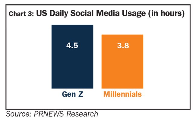 Yes, they’re tremendous consumers of social media (see charts 2, 3). And one study says they spend 9 hours daily in front of screens. Of course, that includes screen time in classrooms and additional engagement with online learning, which, as you’ll see below, is something Gen Z embraces for its professional life.