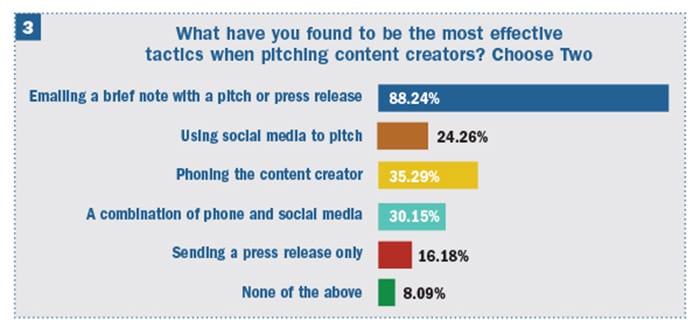 The largest response to the survey is seen in chart 3, where nearly 9 in 10 respondents said the most effective pitching tactic is an email with a brief note or press release.