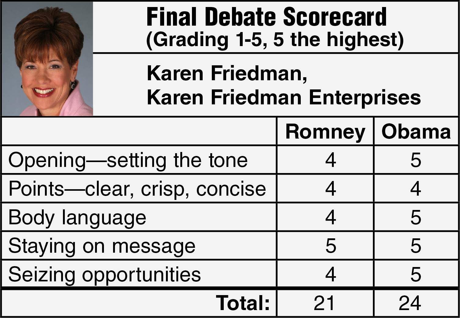 "The final debate was a bit of a sleeper in comparison to the others—both candidates appeared well-rehearsed and more practiced than ever before," says Friedman.