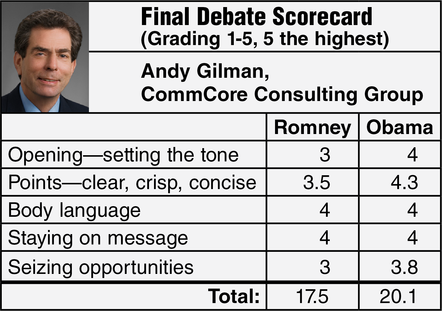 Gilman says body language was not an issue like it was during the first two debates. "Both Obama and Romney looked at one another often when making points, and each had normal and subtle gestures, unlike some of the finger pointing in the second debate," says Gilman.