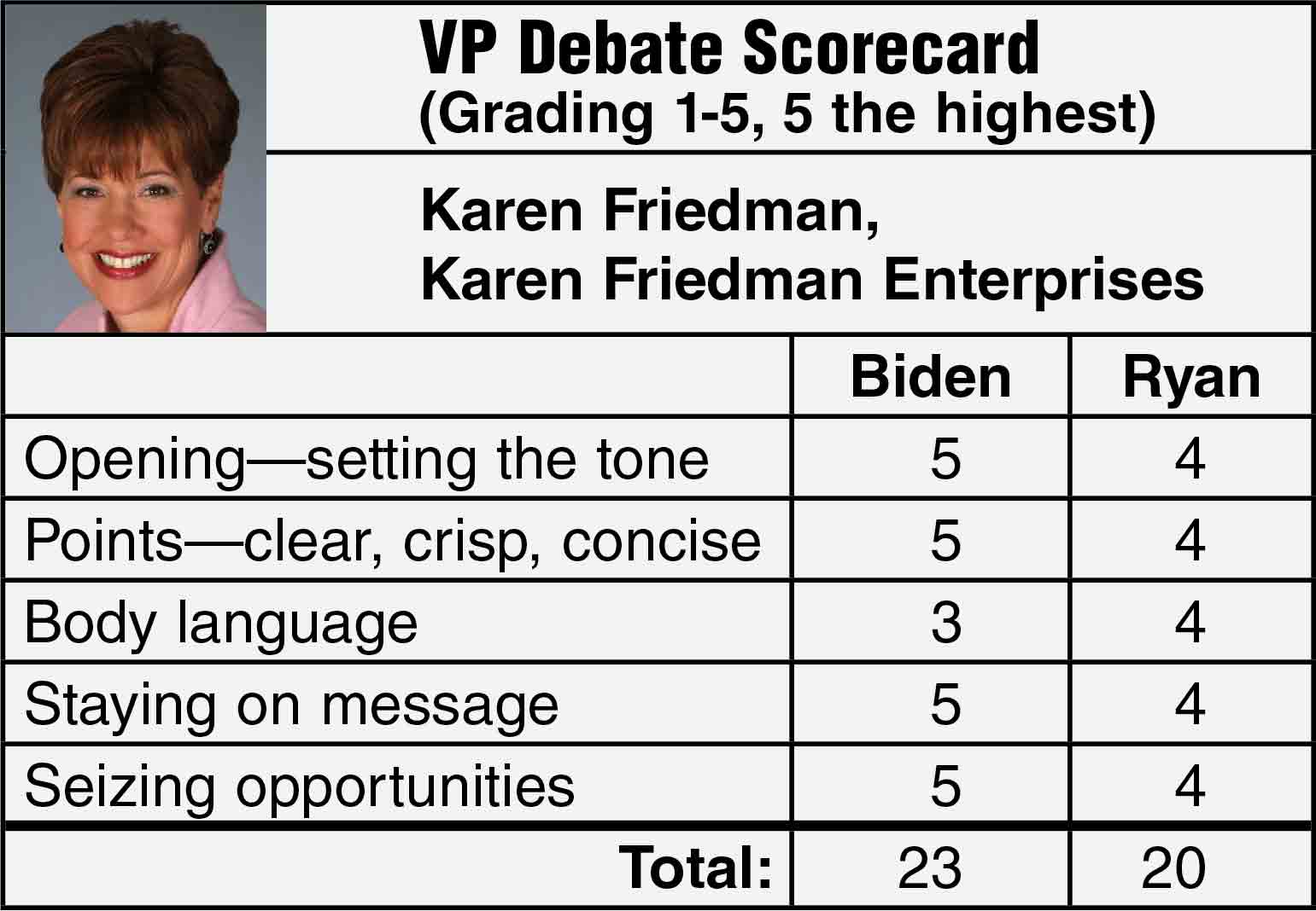 For communications coach Karen Friedman of Karen Friedman Enterprises, Biden did what his boss should have done: He challenged and refuted his opponent’s points and spoke with passion and conviction. "Unlike the president, he came out swinging as opposed to backing into his answers," says Friedman.