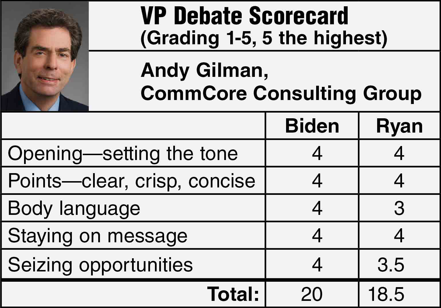 Andy Gilman, CEO of CommCore Consulting, says Joe Biden went beyond addressing President Obama's shortcomings in his Oct. 3 debate with Mitt Romney. "Biden did what he's always done well—he strongly defended the president," says Gilman. "Sometimes with surrogates, they do a better job of articulating their principal's convictions than the actual principals—and sometimes, that happens in the corporate world as well."