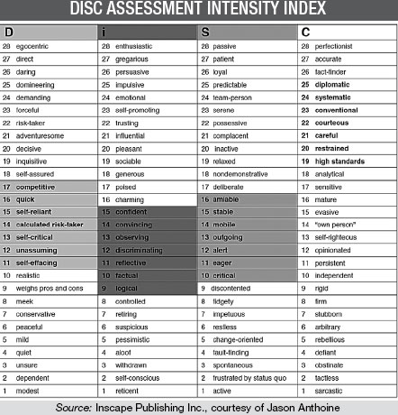 with. For a sample DISC summary with a list of traits and characteristics, see
