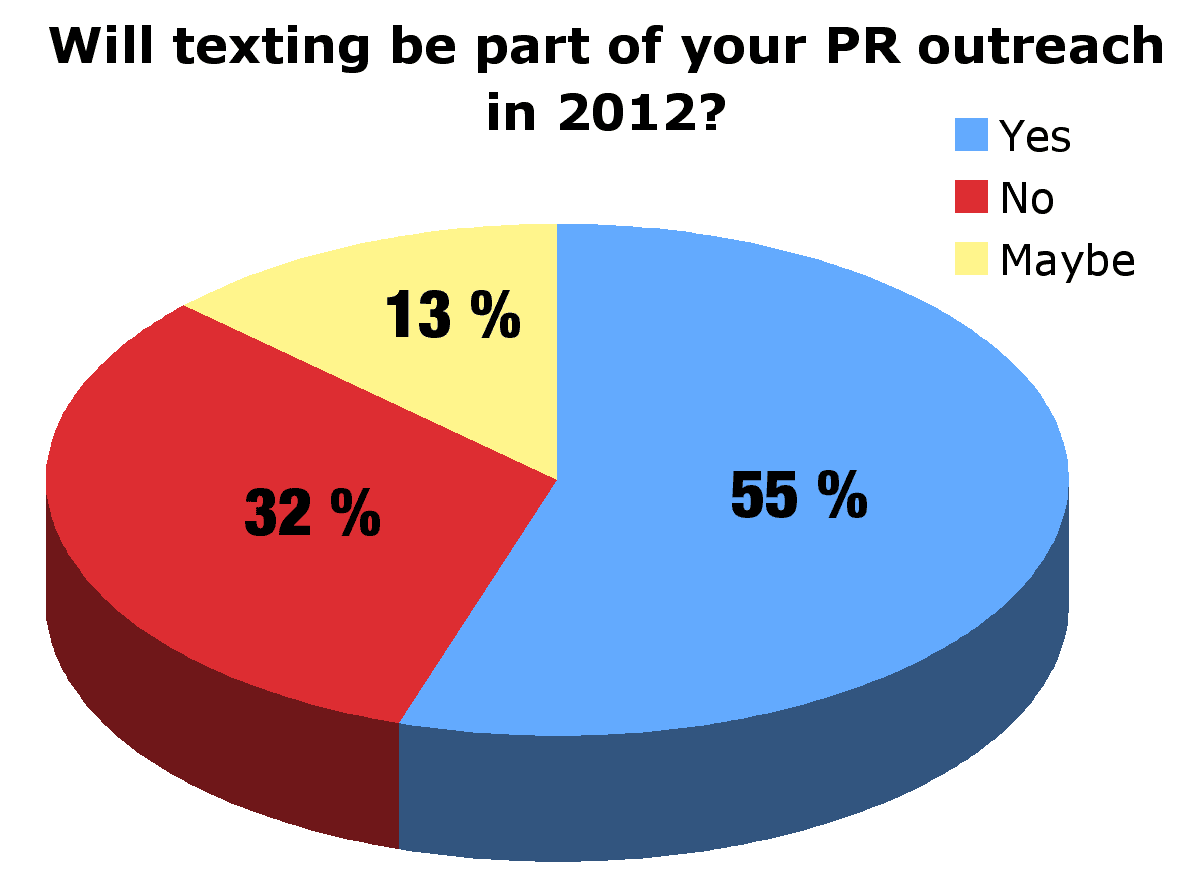 Based on that information, we decided to ask PR News' online community the following question: Will texting be part of your PR outreach in 2012? The response to the poll was encouraging: 55% said yes, they plan to, 32% said no and 13% said they might. While many brands are often seeking to release the shiniest new object in the form of customized mobile apps, it may be worthwhile to consider the opportunities for your brand through texting-based outreach.