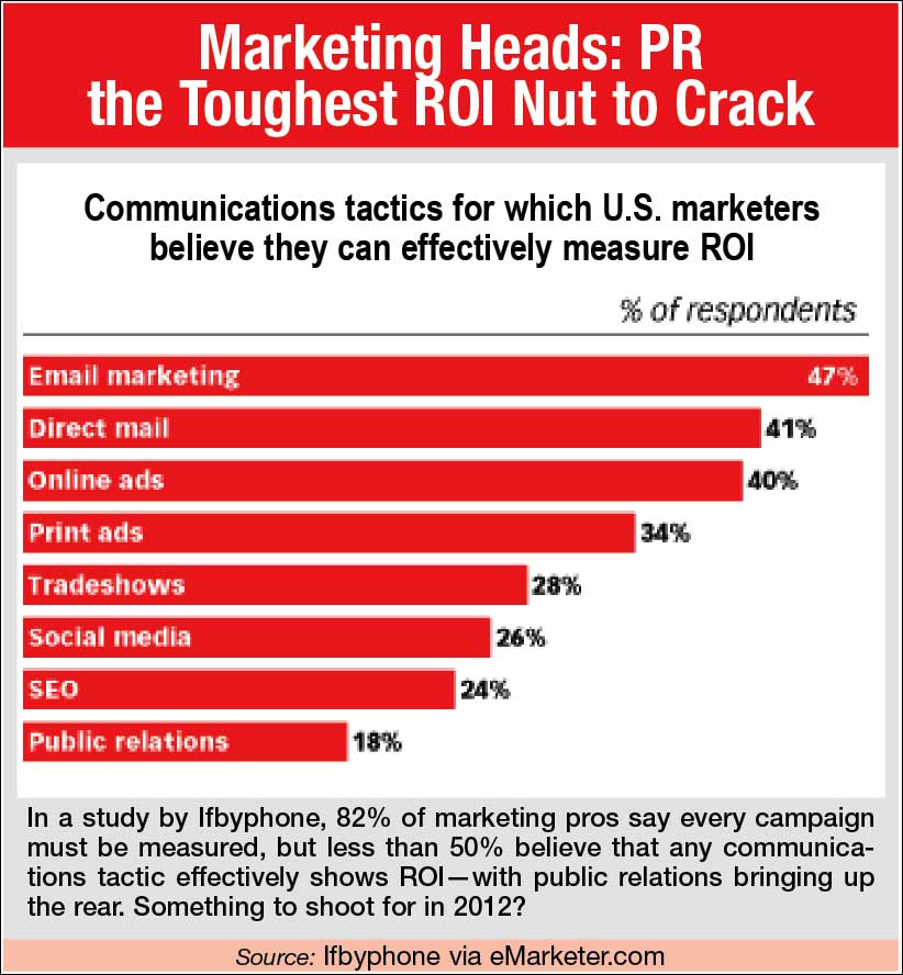 Where this data takes PR in 2012 is anyone’s guess, given the fact that marketers find public relations to be the toughest discipline to measure ROI (see chart on this page). Other PRSA/MWW study findings include: