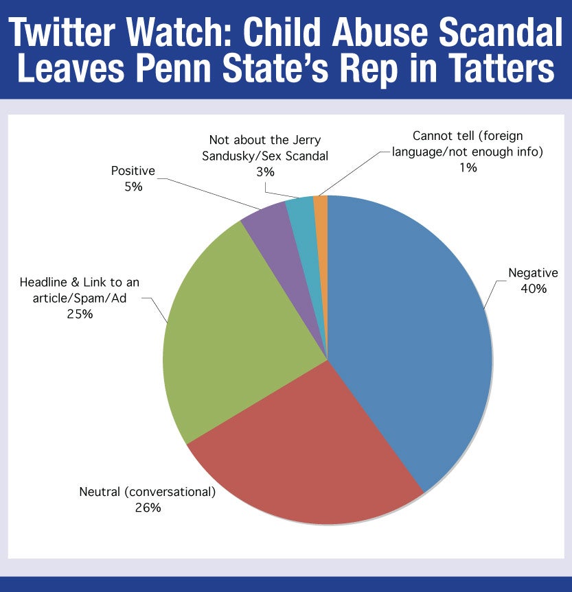 Using the words “Penn State,” “Paterno” and “Sandusky,” analytics company PeopleBrowsr (in an effort exclusive to PR News) tracked the sentiment toward the university from Nov. 3—the day the scandal hit—to Nov. 9. From a total of 434,831 Twitter posts, PeopleBrowsr sampled nearly 4,500 for sentiment—negativity reigned (40% negative vs. 5% positive). Not good for a once-proud university. See Katie Paine’s Image Patrol on page 1 for further crisis analysis. Source: PeopleBrowsr (exclusive to PR News) |