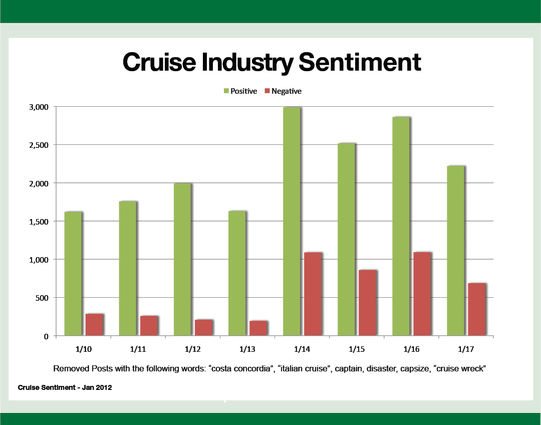 It wasn’t just Carnival Cruise Lines that took a reputation hit after the Costa Concordia disaster in Italy: Negative sentiment toward the cruise industry in general rose dramatically, as demonstrated by data from PeopleBrowsr. After filtering close to 210,000 Tweets—deleting posts specific to the tragedy—PeopleBrowsr found that among a substantial number of positive comments, negative posts on the industry spiked on Jan. 14, the day after the sinking occurred.