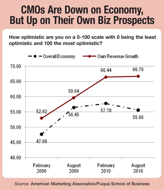 In a new survey of chief marketing officers, the CMOs revealed that while they were fairly pessimistic about the current state of the economy, they were more optimistic with their organization’s ability to generate revenue (see graphic below).