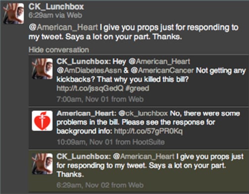 | Situation: A news comedy show aired a segment that said the American Heart Association fought a bill that would have rewarded healthy behavior. In fact, the bill might have opened the door for discrimination of people with preexisting conditions or who were predisposed to the conditions. After the segment aired, there was backlash via Twitter and Facebook, including the above Twitter string (Twitter handle intentionally blocked out). Lesson learned: Staying quiet will not make a crisis go away. |
