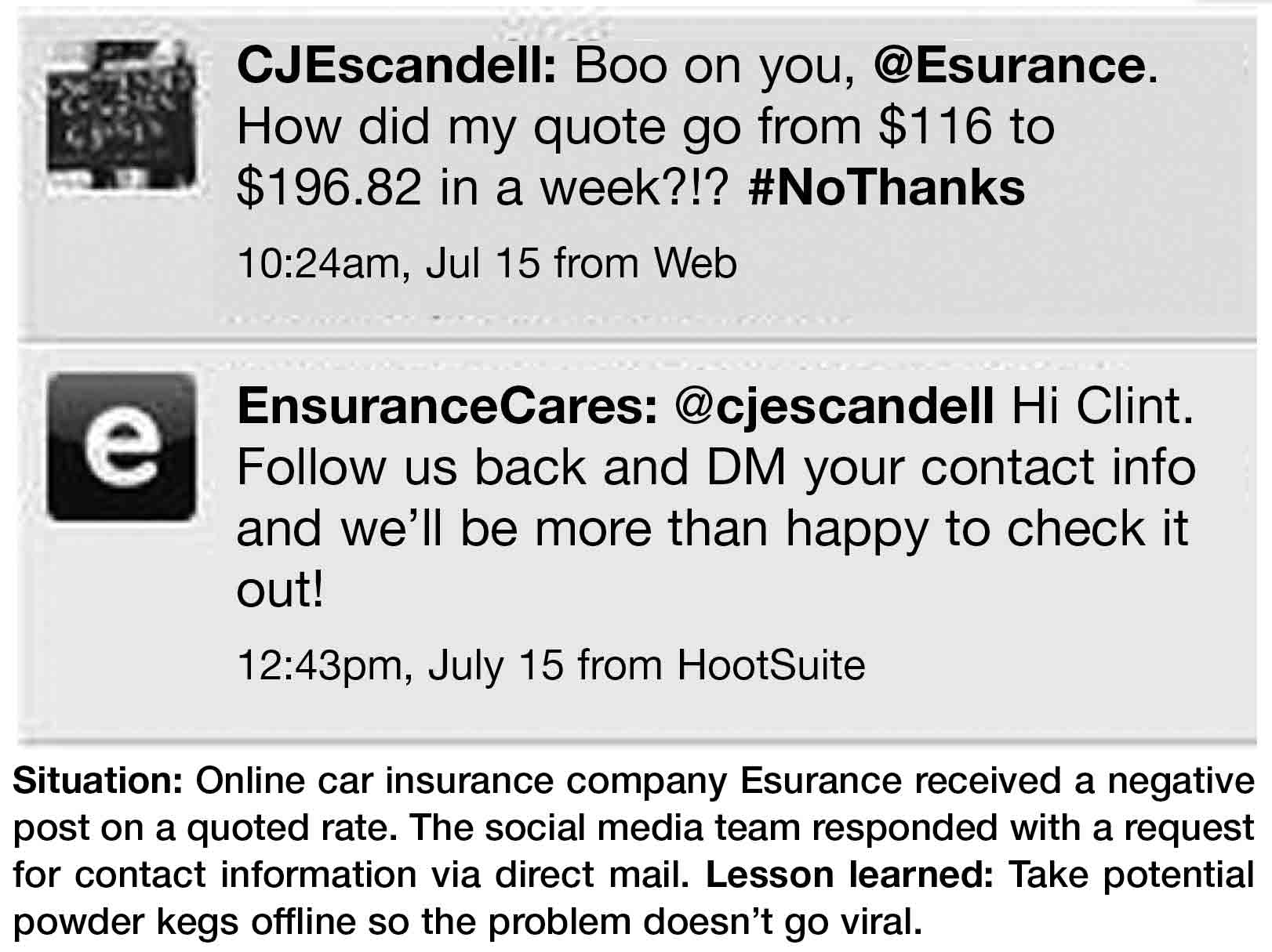 The same structure and philosophy is mirrored at online car insurance company Esurance. There’s a team of six service agents who monitor Twitter for customer-related issues, and they have the authority to help a person right away, says Shannon Greevy, social media communications strategist, Esurance. “We don’t have a complicated system,” she says. “We want to be able to help people immediately.” (See the tweets for an example.)