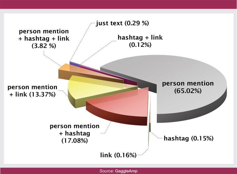 To find out what inspires retweets, enterprise social media platform provider GaggleAmp tracked 1.9 million tweets on July 12-13, then segmented out retweets and studied them. So what is the major retweet driver? Mentioning a person (using @ in front of a Twitter handle). The sections of the pie that have a person-mentioned element add up to 99.29%.
